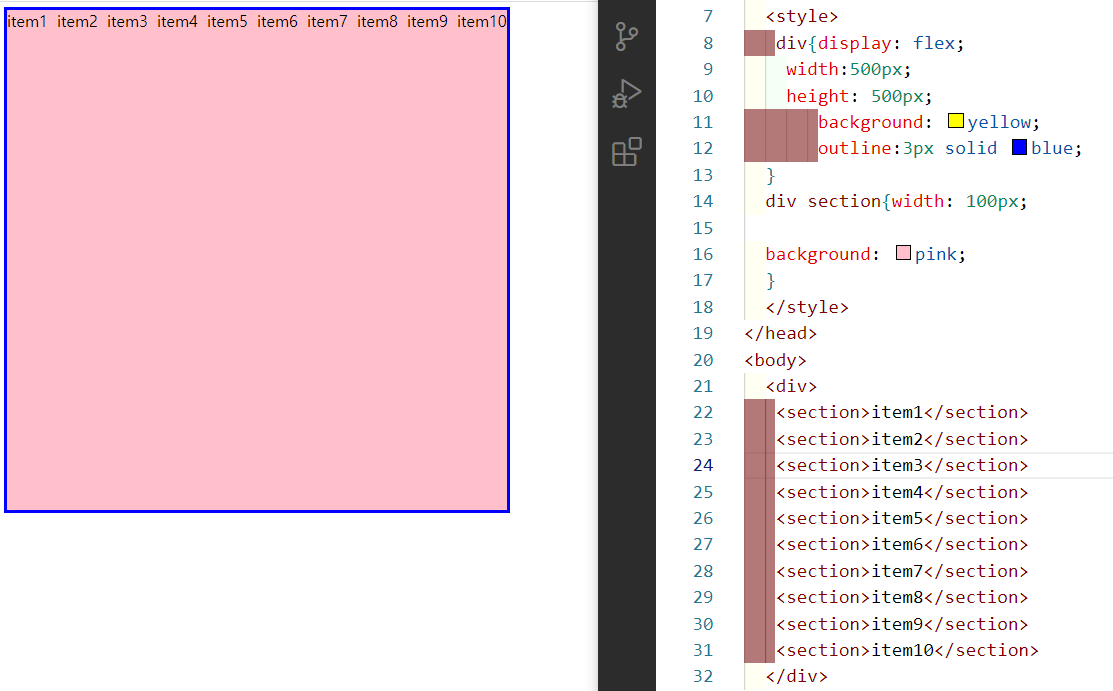 flex-wrap 줄바꿈 관련 속성 flex-wrap flex-wrap:[nowrap],[wrap],[nowrap] flex-direction:row 일 경우 기본값 nowrap 줄바꿈하지 않음. 자식요소에 width 를 넣었지만 부모요소에 넓이가 500px 이라서 100px 적용 안되어 있는 상태이다. (shrink) 자식요소가 너무 많고 더이상 수축하지 못할 경우엔 부모요소 밖으로 나가게 된다. flex-wrap:wrap(줄바꿈) 부모컨테이너 크기 300px, 자식요소의 크기(height 100px) 자식요소가 많아서 부모 요소 밖으로 넘치게 됨 wrap-reverse(줄바꿈-거꾸로) flex-direction:column; 일 경우 CSS 2023.10.30