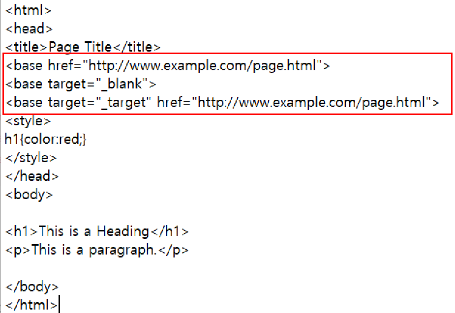 - base 문서 안의 모든 상대 url 이 사용할 기준 url 을 지정합니다. 문서에는 하나의 <base>요소만 존재할 수 있습니다. <base>요소가 여러 개 존재하는 경우 첫 href 와 첫 target 만 사용하며 나머지는 모두 무시합니다 - href: 문서 내 상대 URL 이 사용할 기준 URL. 절대 및 상대 URL 을 사용할 수 있습니다. - target: target 속성을 명시하지 않은 <a>, <area>, <form>요소가 탐색을 유발했을 때, 그 결과를 보여줄 기본 브라우징 맥락. 키워드나 저작자 정의 이름으로 지정합니다.